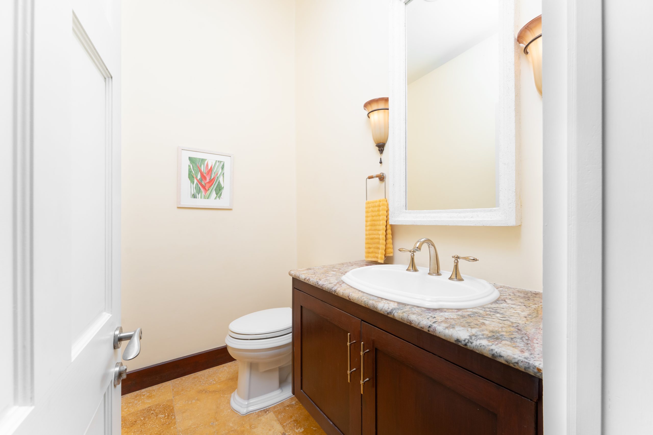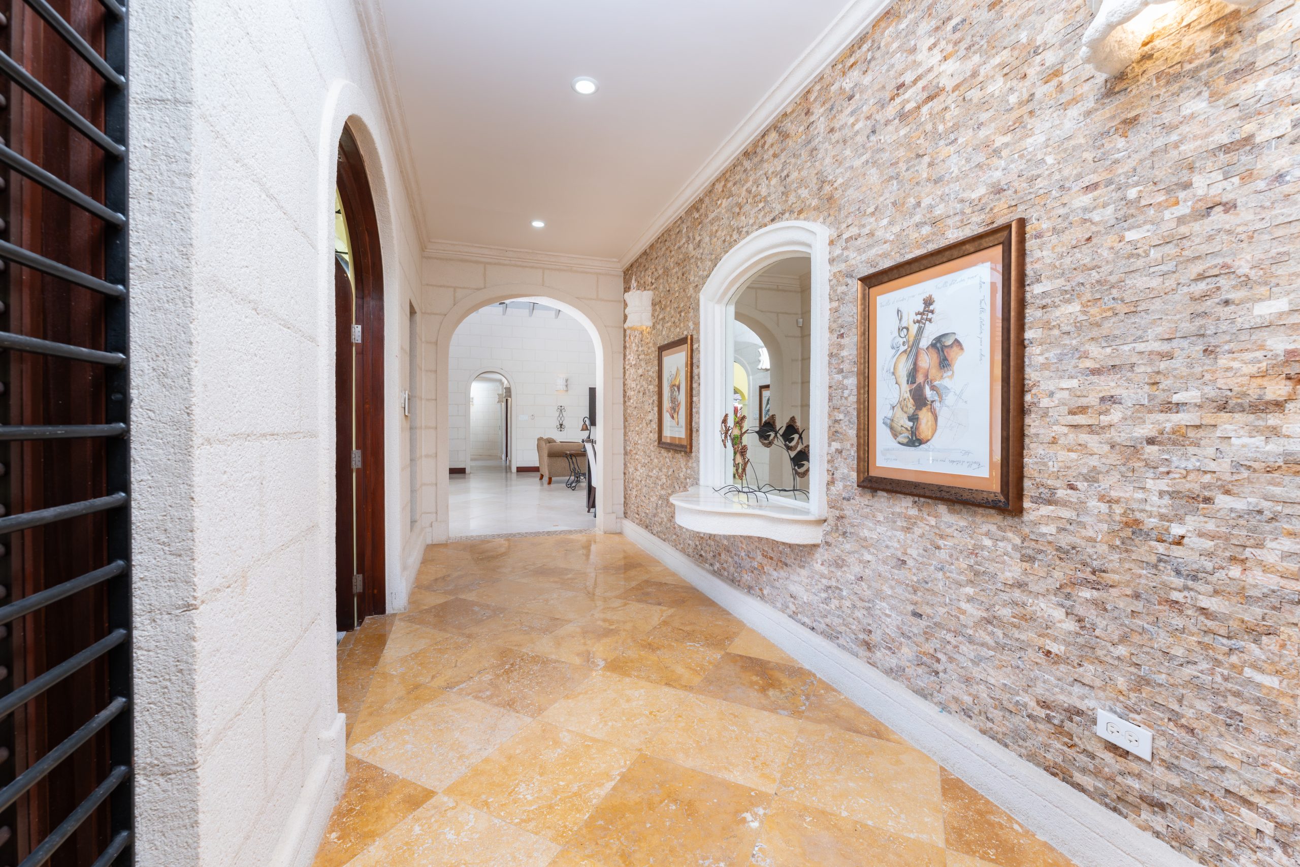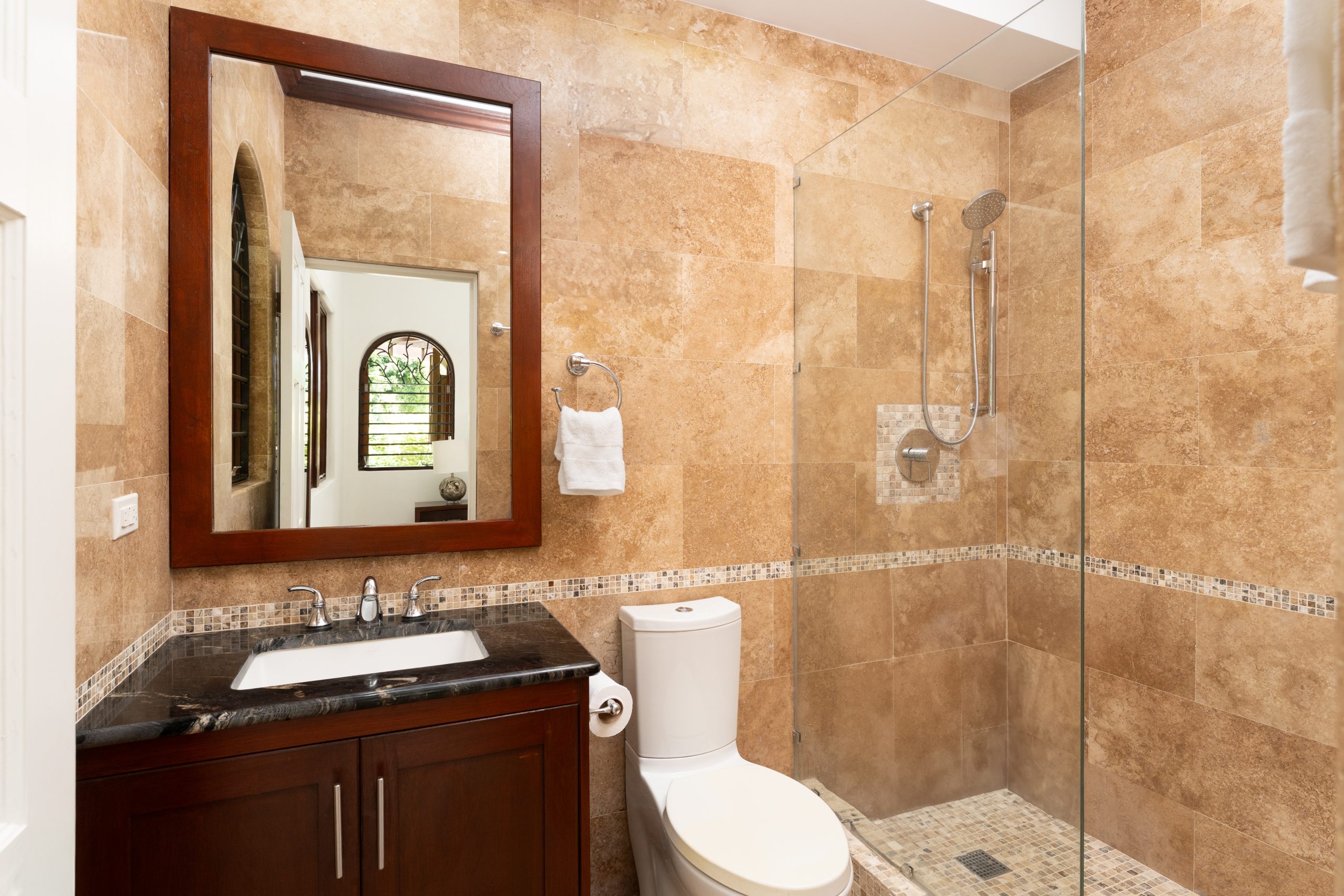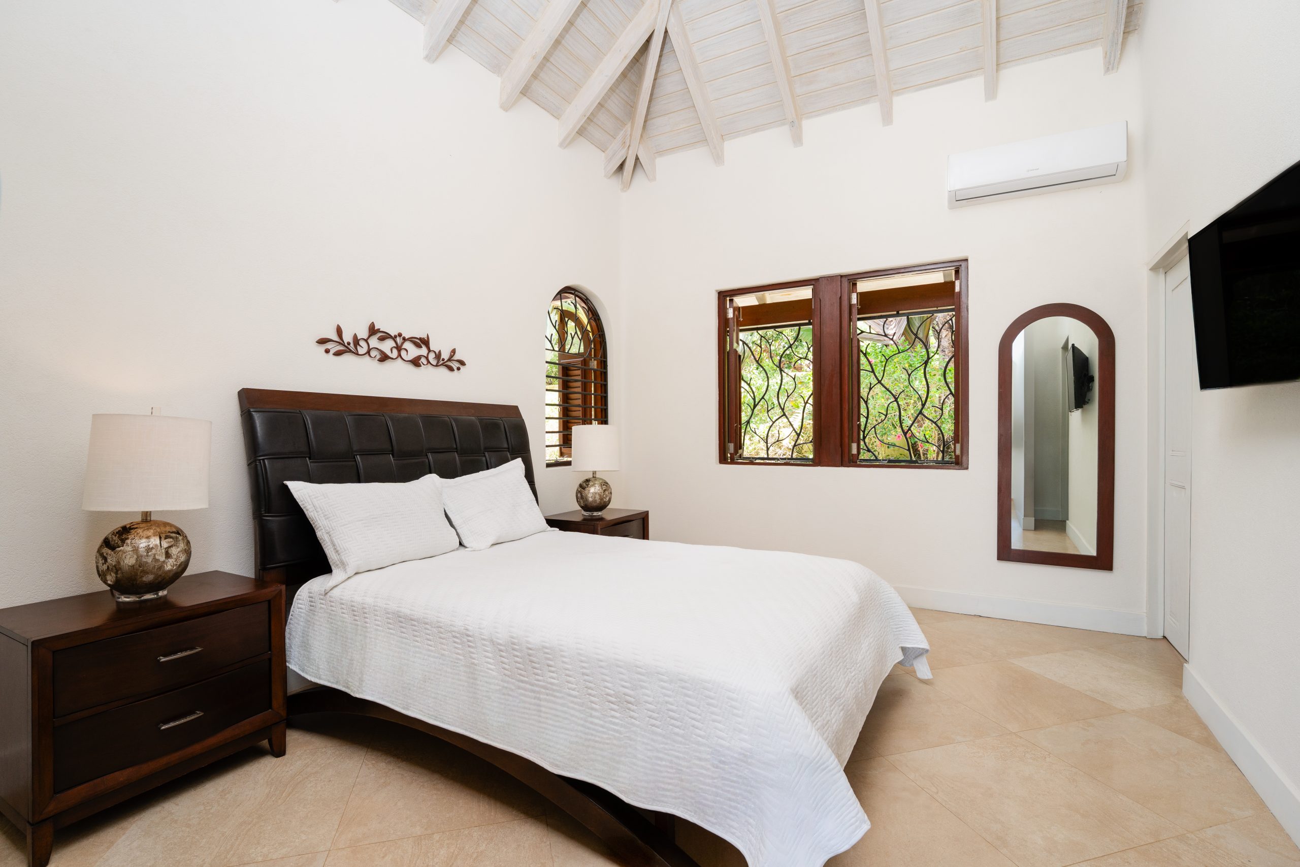 Down the hallway, all four air-conditioned bedrooms have ceiling fans. Three generously sized guest rooms each include en-suite bathrooms and direct access to the covered terrace with sea views.