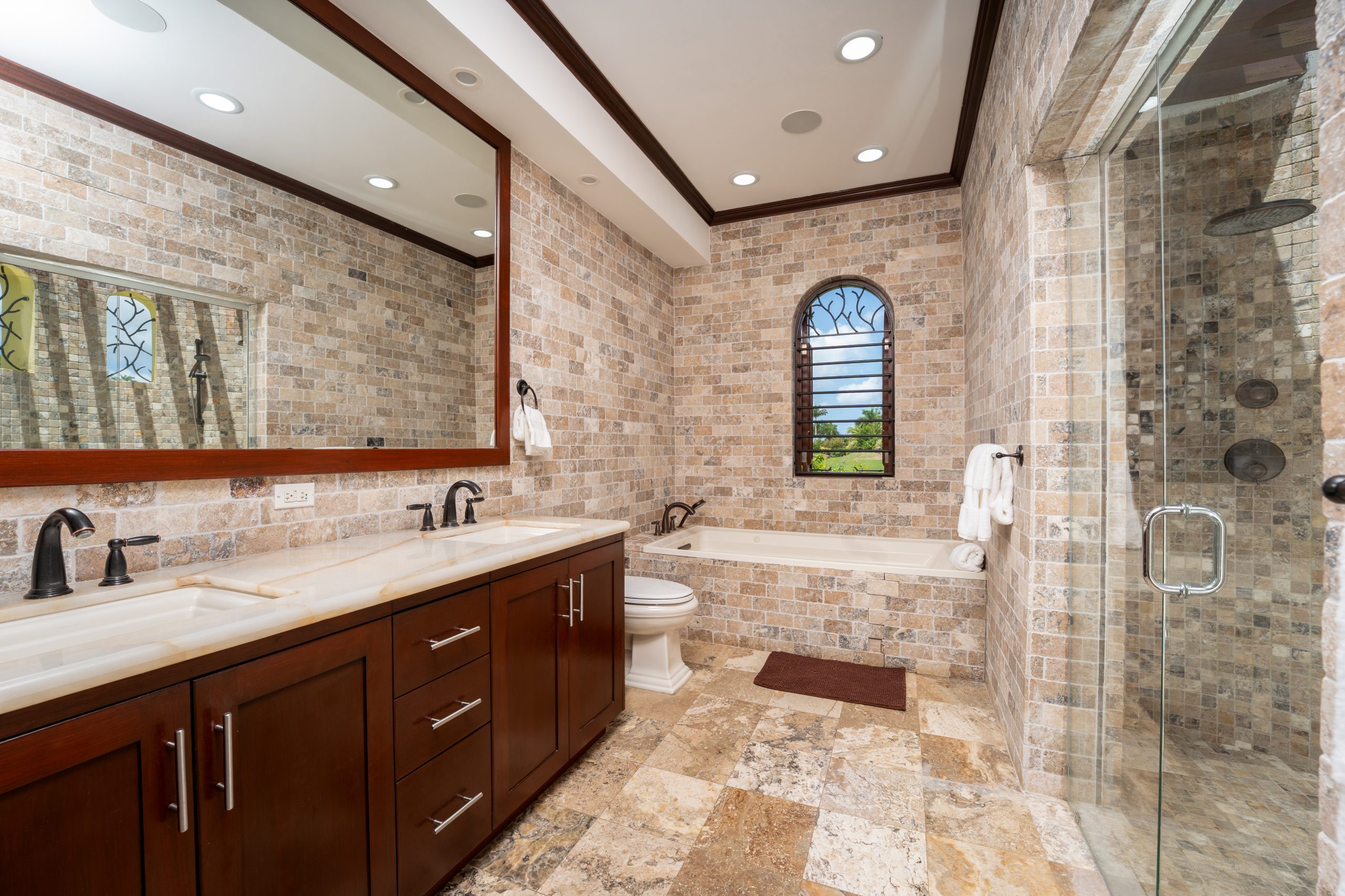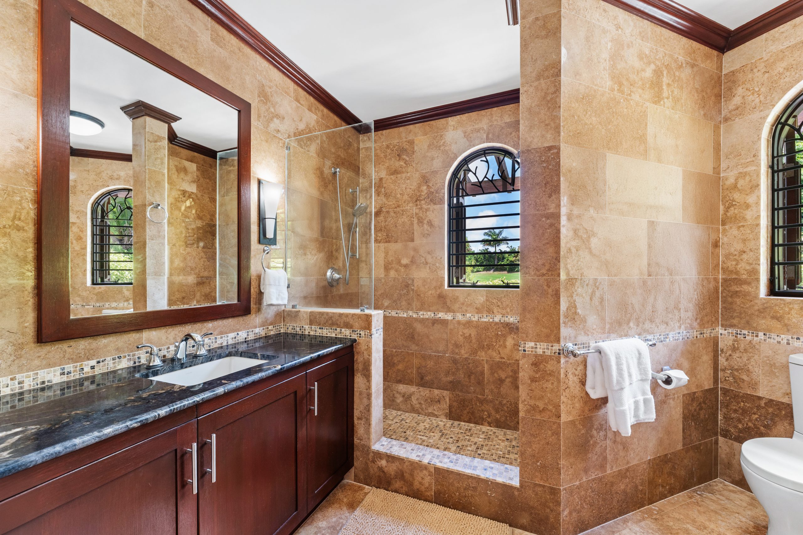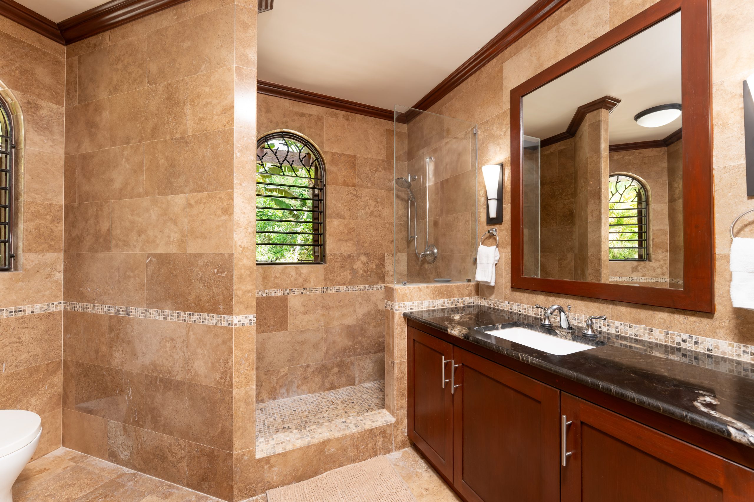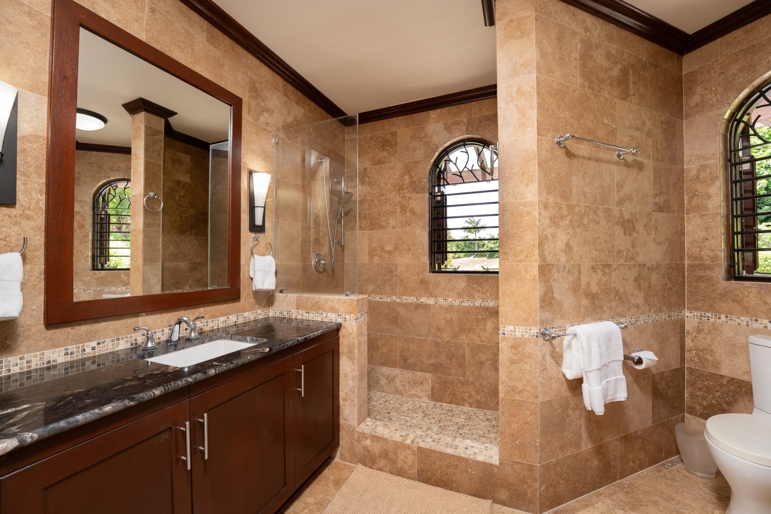 The master suite is something special. Walk-in closet, luxurious bathroom with double vanity and soaking tub. But the real star? The outdoor shower surrounded by lush tropical greenery, open to the sky. Morning showers feel like a ritual here.