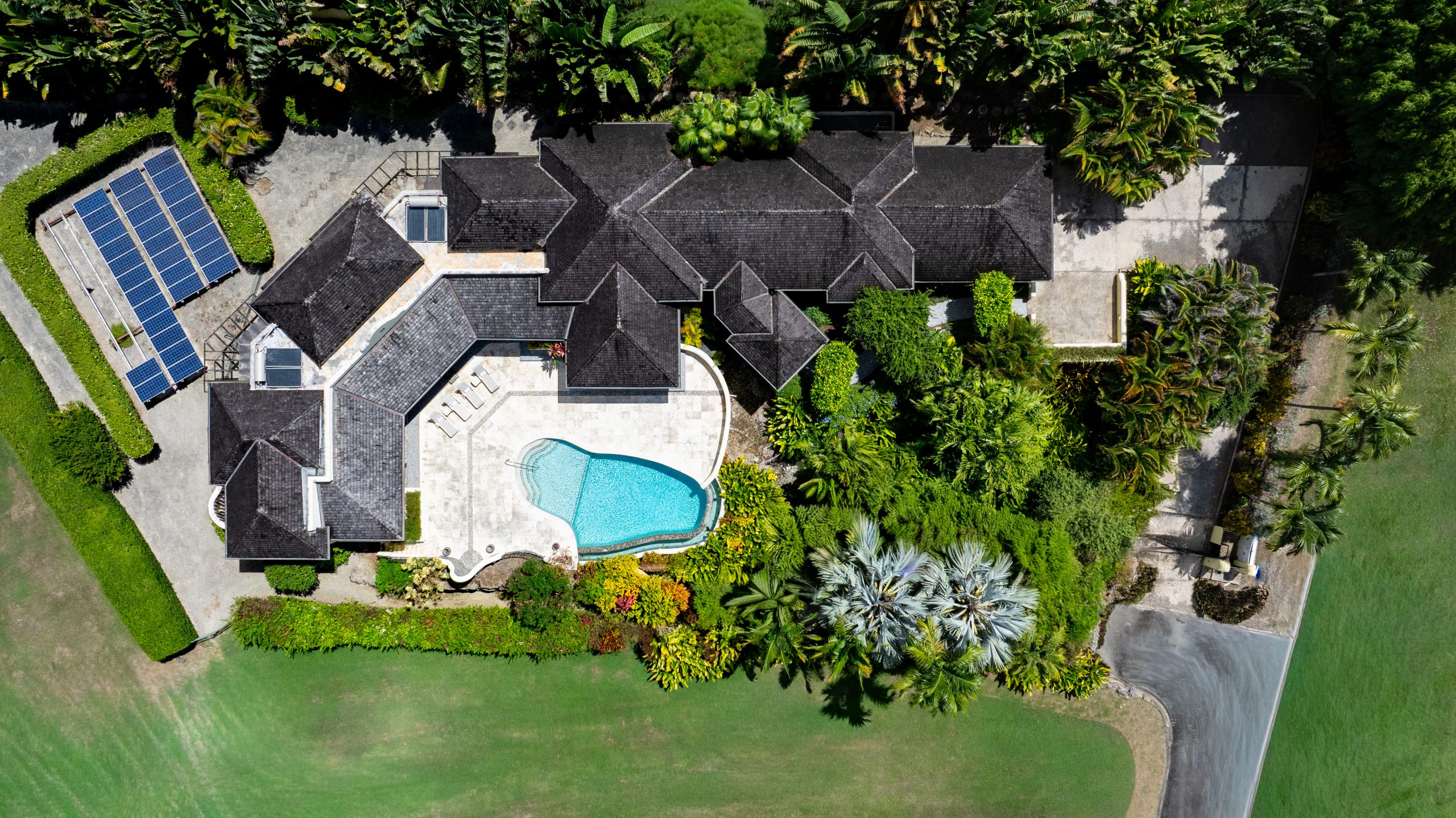 The expansive terrace holds two al fresco dining areas, a lounge, and an outdoor bar. The saltwater pool (with electric water heater) sparkles in the center, sun loungers lining the deck. A large outdoor shower stands ready for post-swim rinses. Solar panels discreetly tucked to the rear help offset electricity usage.