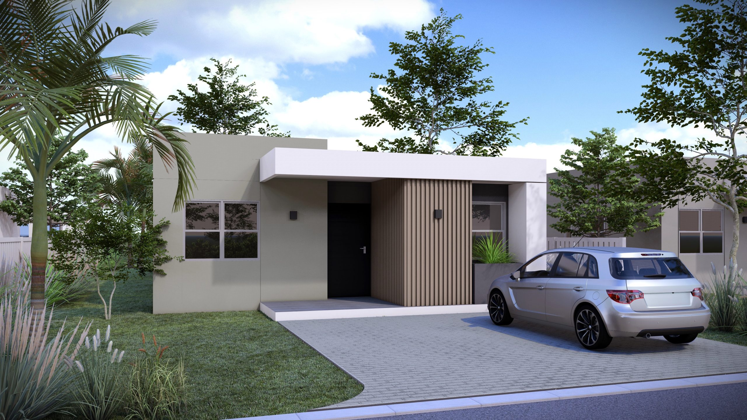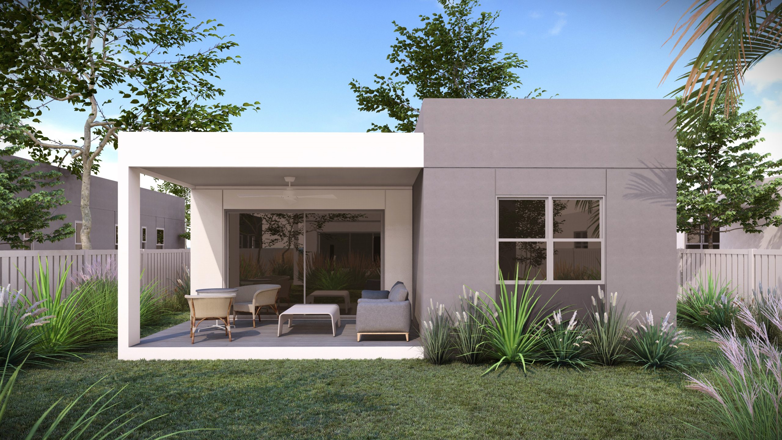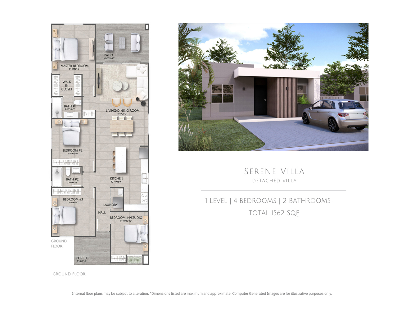 One of the available home designs is Serene (pictured), a spacious four-bedroom, two-bathroom residence featuring an open-plan layout, a fully equipped kitchen with appliances, a master suite with a walk-in closet, a large patio, a paved parking area, a fenced backyard, and a landscaped garden.